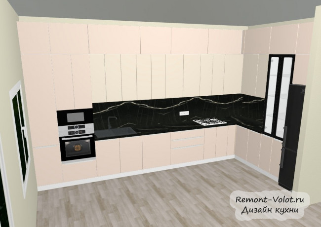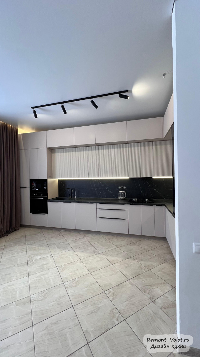 Кремовая кухня с фасадами бриз без ручек и черным фартуком