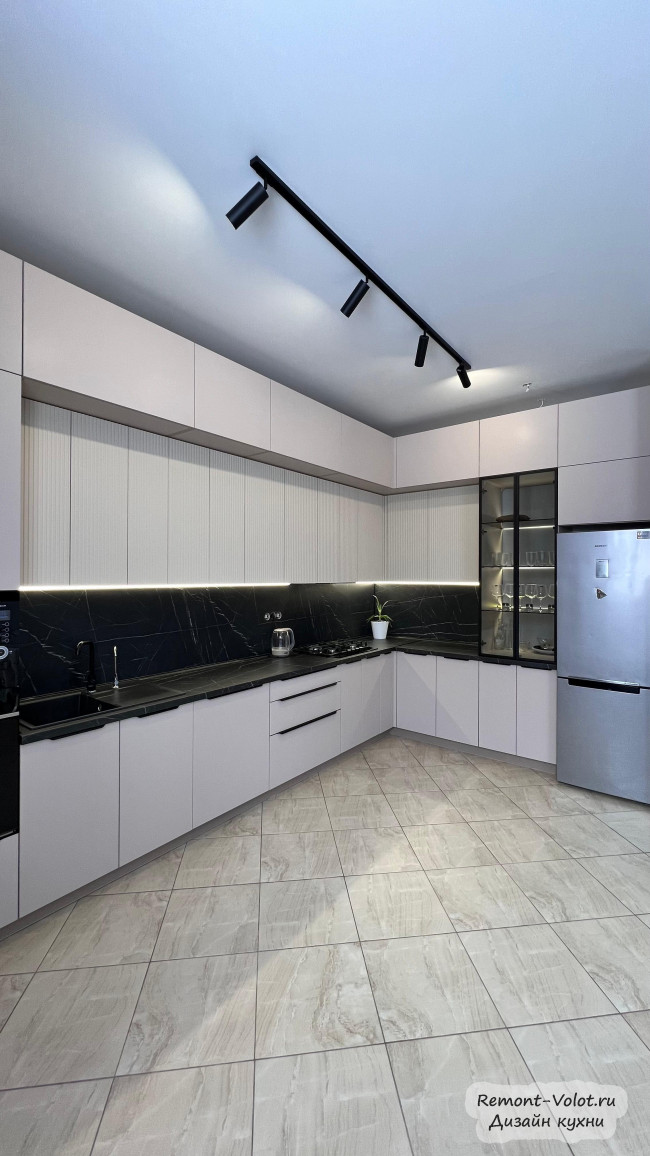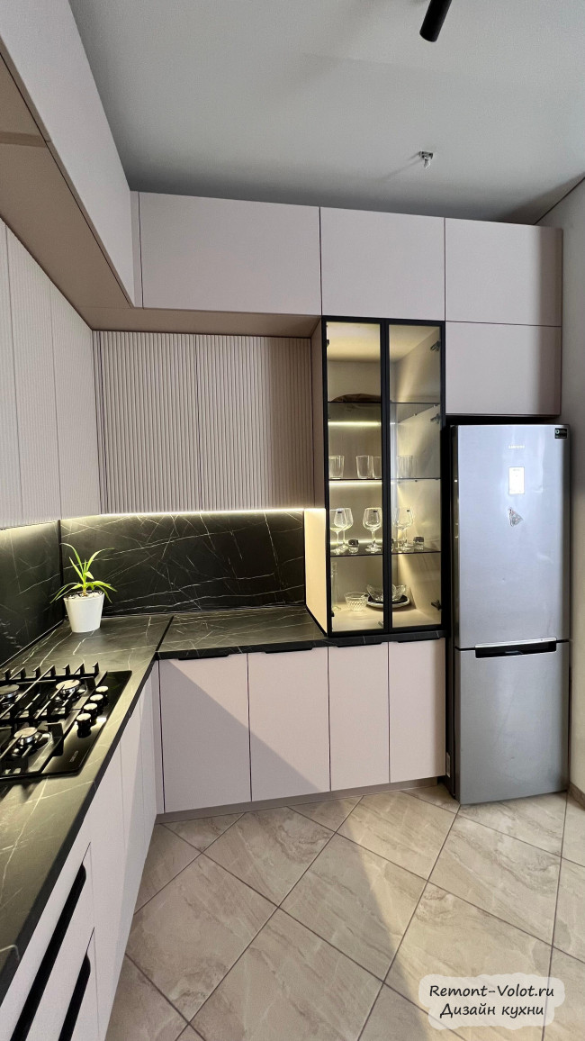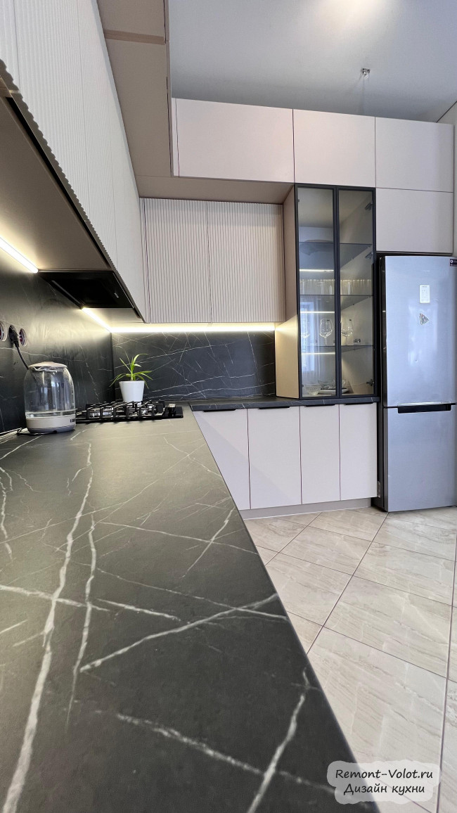 Теги: бежевая кухня угловая черный фартук черная столешница натяжной потолок встроенная техника буфет на кухне