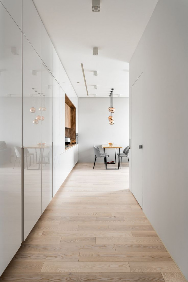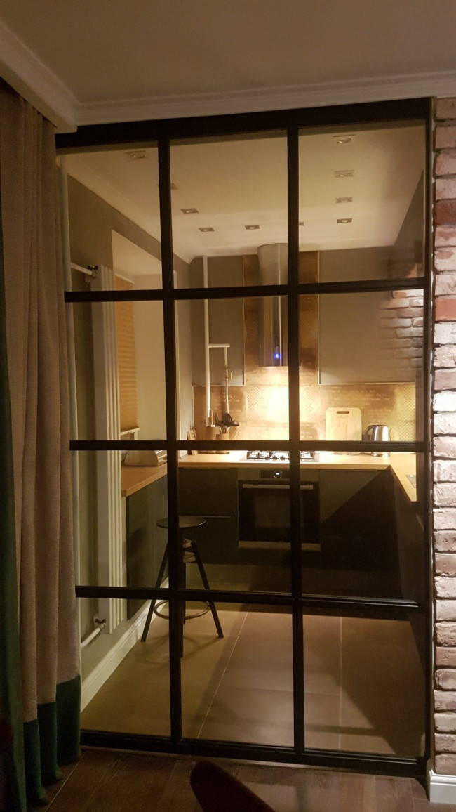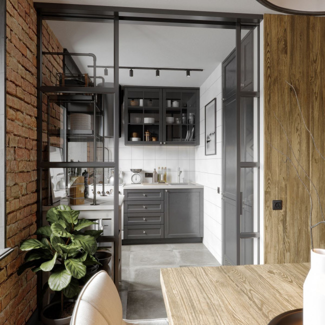 Когда кухня фактически является продолжением коридора, стандартные модули с массивными ручками перегружают интерьер, превращая квартиру в «склад мебели». Прием мимикрии позволяет растворить гарнитур в пространстве.