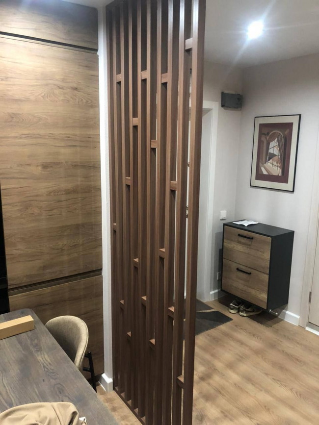- Реечные конструкции: Вертикальные ламели из МДФ в шпоне или из массива дуба создают ритм и частично скрывают происходящее за ними. Они работают как «жалюзи»: под одним углом кухня видна, под другим — полностью скрыта.