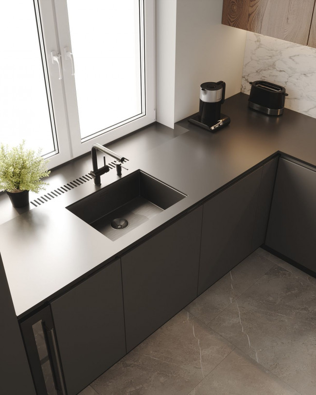 Длинный перенос часто подразумевает Г-образную или П-образную конфигурацию мебели. Если ваша столешница сделана из ЛДСП, стык в районе мойки — «мина замедленного действия». При переносе коммуникаций на другую стену старайтесь планировать расположение чаши так, чтобы она находилась в цельном полотне материала. В идеале — используйте искусственный камень (акрил или кварц). Эти материалы инертны к воде, позволяют сделать интегрированную раковину без швов, где не будет скапливаться грязь и грибок.