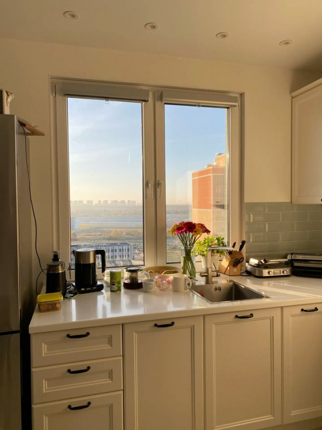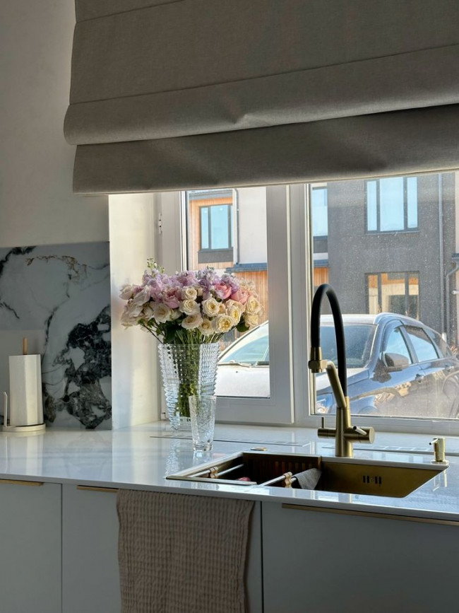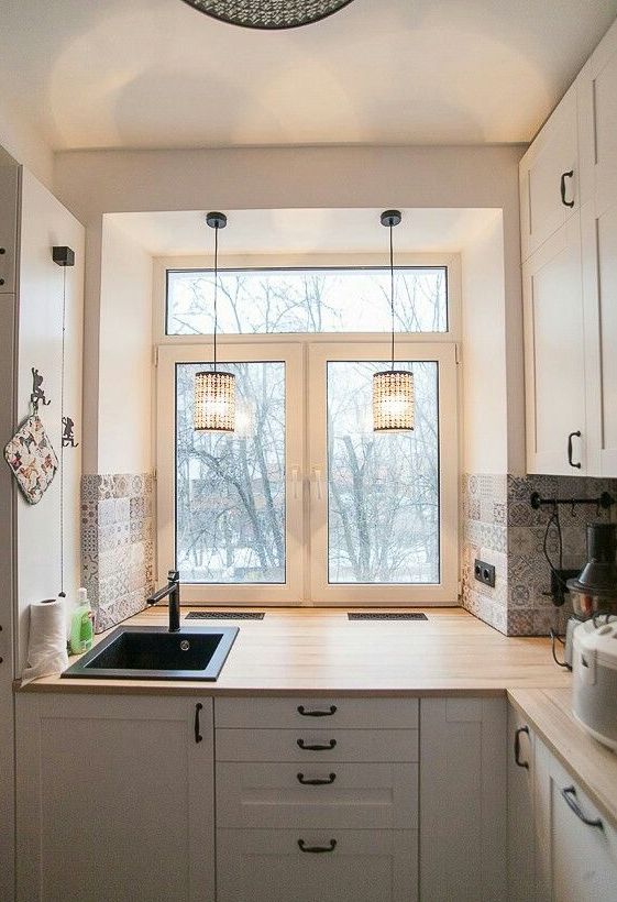 Что касается самого окна, выбирайте смеситель с откидным изливом (байонетом), чтобы он не мешал полному открыванию створок. Расстояние от смесителя до стекла должно быть не менее 15–20 см, иначе каждая помывка овощей закончится утомительным протиранием стекла.