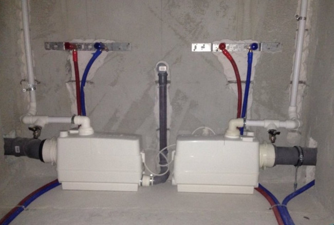 Сололифт. Если уклон соблюсти невозможно, устанавливается санитарный насос. Он принудительно измельчает отходы и качает воду. Это позволяет использовать тонкие трубы (28–32 мм) и вести их даже с обратным уклоном. Но помните: насос зависит от электричества и требует регулярной чистки от жирового налета.